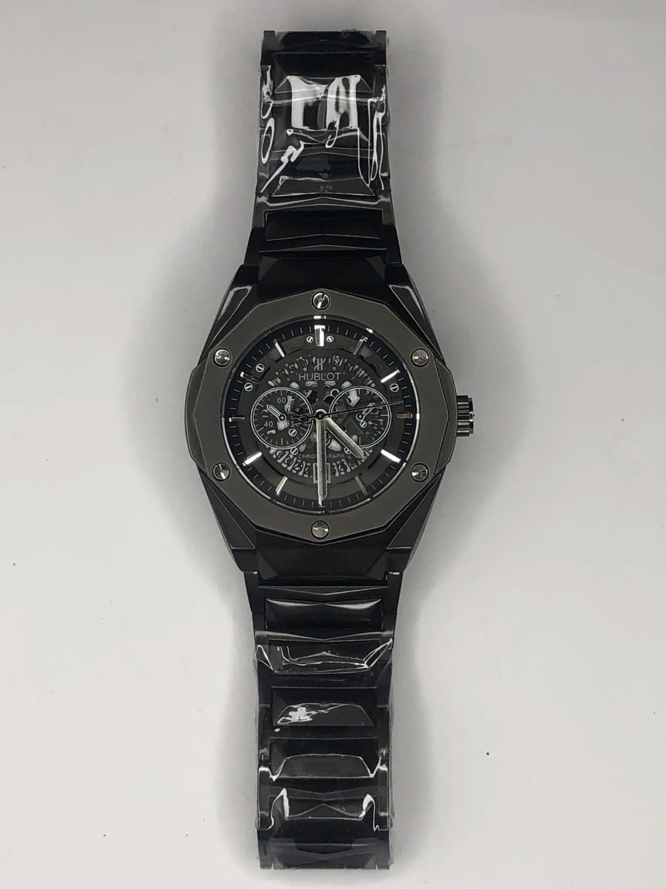 Make a bold statement with the Hublot Skeleton Dial Black Chain Watch, a sleek and stylish chronograph designed for those who love the luxury aesthetic at an accessible price.